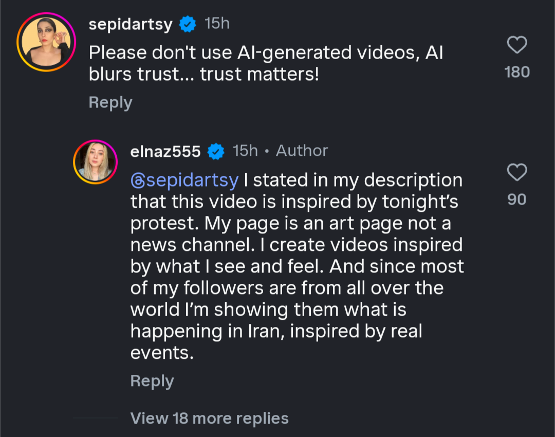 One widely shared AI slop video depicted a bird’s eye view of Iranian street protests accompanied with the (clearly unironic) caption “All Eyes on Iran.” At the time of writing this, the video has accrued over 80 million views, shared voraciously as if it were actual news: the over-stylised AI-slop aesthetic supposedly serving as some sort of stand-in for the void created by a nationwide communications blackout. It stands as a cinematic rallying cry for a version of reality we want to be; never mind the messy inconvenience of whether it actually is – or not.